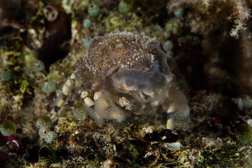 Il soggetto è un granchio decoratore (famiglia Majidi), un granchio che si mette sul dorso polipi vivi di coralli molli per mimetizzarsi. L’esemplare nella tua foto appartiene alla specie Cyclocoeloma tubercolata, e ha sul dorso un grosso (relativamente a lui) corallimorfario, una sorta di anemone di mare che normalmente forma colonie.