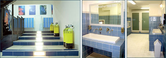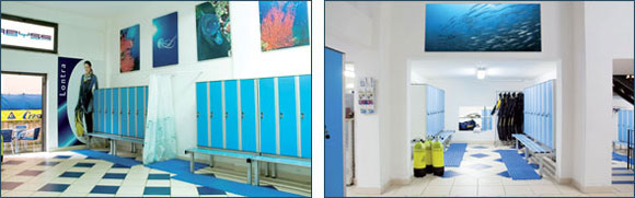 Scaricata l’attrezzatura di fronte al diving si parcheggia nel parcheggio gratuito al porto; un arredamento curato e confortevole accoglie alla reception e introduce ai vasti spogliatoi. Ci si cambia utilizzando uno degli 82 armadietti personali con serratura.