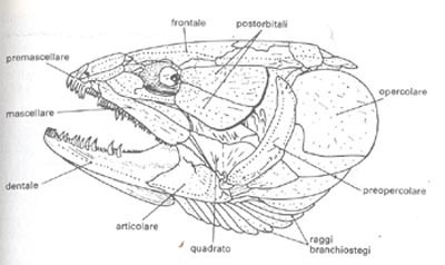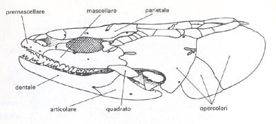 Altra parte che concorre alla formazione del cranio è lo splancnocranio, composto da una grande quantità di ossa di tipo mobile, di origine opercolare che rivestono le fessure branchiali, e relative alle arcate viscerali.
