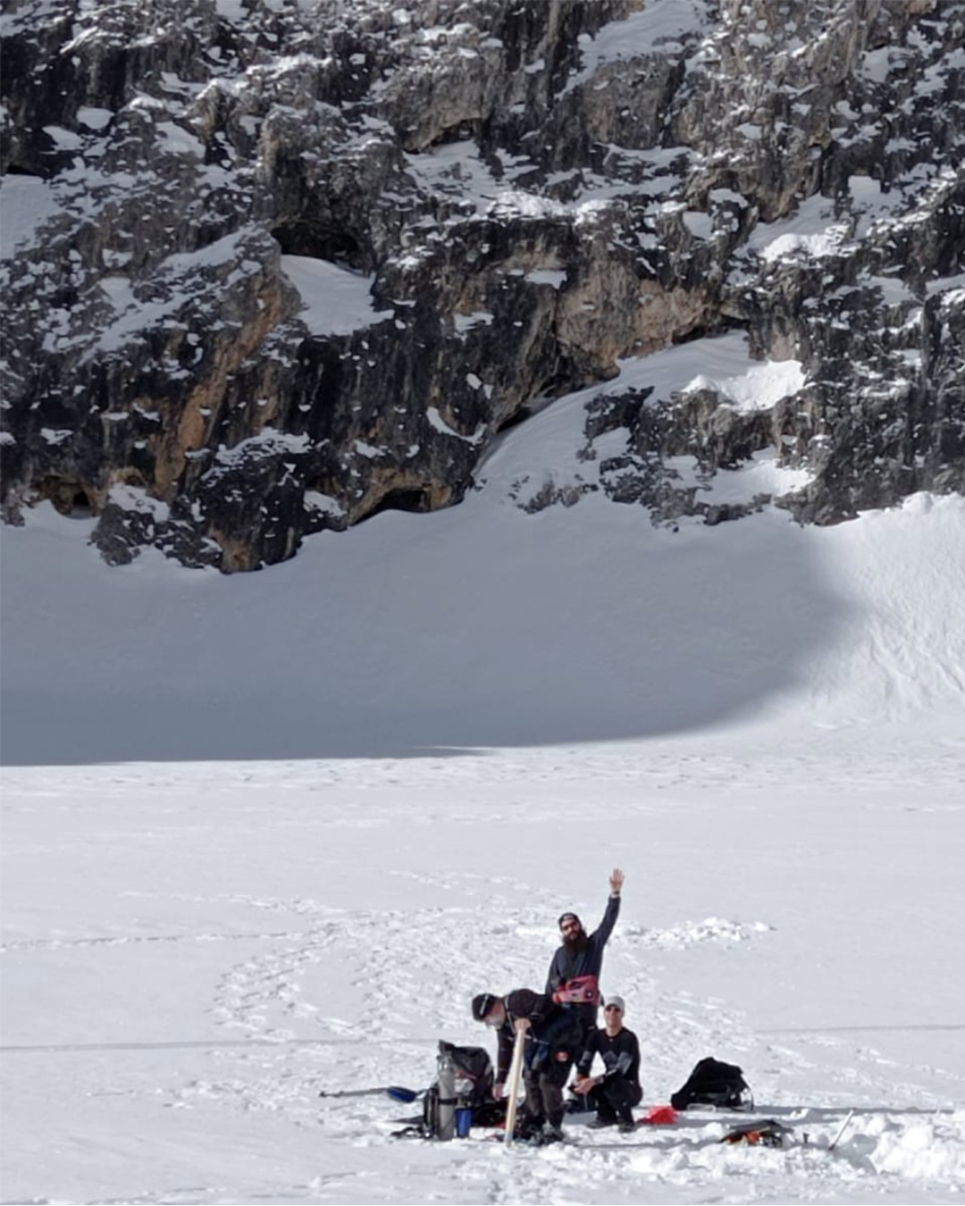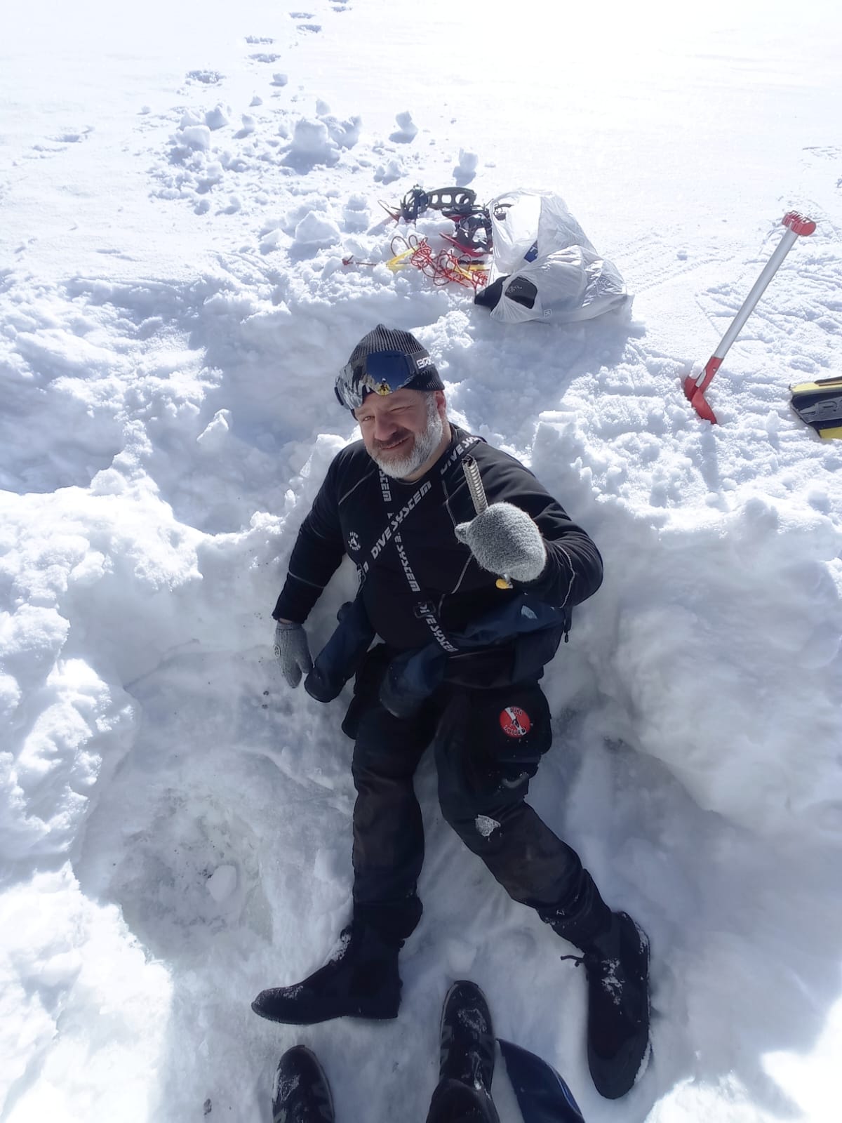 Dopo 9 ore di cammino e fatiche estremi, carichi con tutto il necessario alla sopravvivenza, alla sicurezza e soprattutto ad affrontare la penetrazione di un lago ghiacciato e la conseguente immersione sotto al ghiaccio raggiungiamo il bivacco invernale dove possiamo riposare, rifocillarci e stare un po’ meno al freddo. La notte passa nel silenzio di un luogo dormiente e solitario. All’alba iniziamo a prepararci, ci siamo, il lago è poco distante, indossiamo le mute stagne e ci prepariamo a fare quello che abbiamo progettato e simulato, arriviamo al centro del lago, secondo la traccia GPS ci posizioniamo in corrispondenza del punto più profondo e, muniti di pale, iniziamo a scavare nella neve fino a raggiungere, a circa 80 cm di profondità, la lastra di ghiaccio che ricopre il lago.