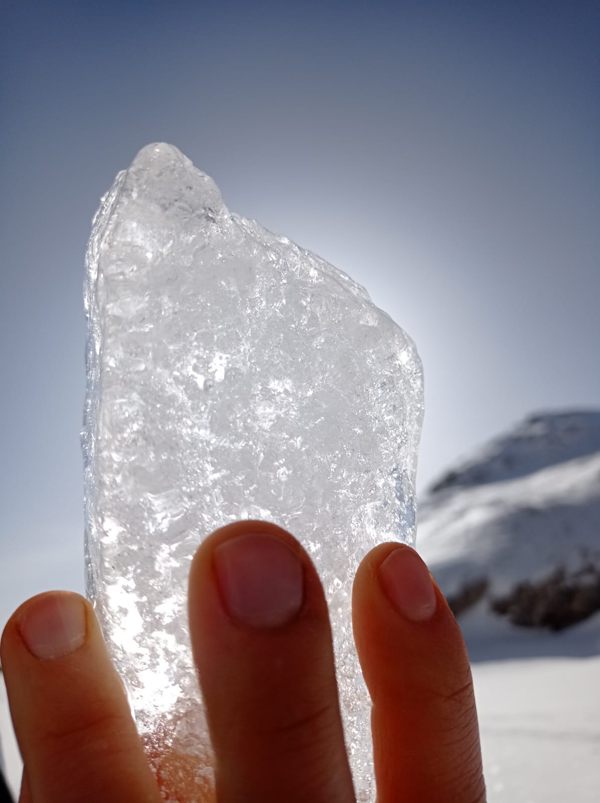Carota di ghiaccio prelevata al Lago di Antermoia durante la spedizione invernale subacquea nelle Dolomiti