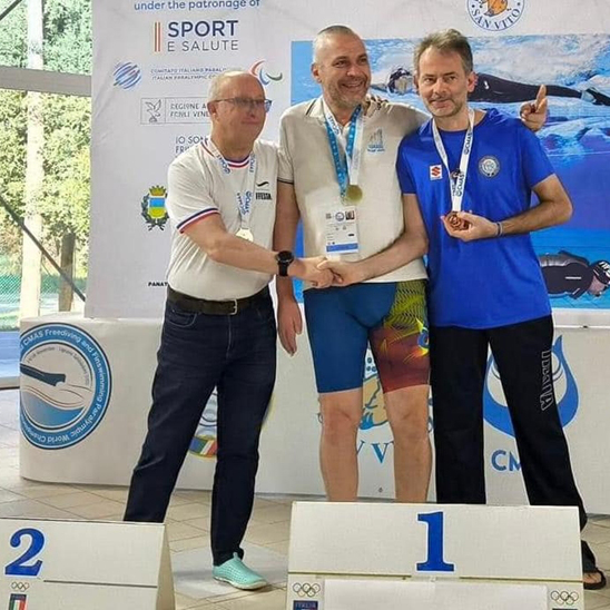 Una volta superati questi dubbi Mancin è tornato ad allenarsi e a gareggiare. Tra i suoi successi più recenti spiccano le medaglie di bronzo ai mondiali paralimpici del 2025, sia nella disciplina statica (categoria 2) che in quella dinamica con pinne (categoria 1 – nella foto il recente podio con Daniele Mazza). Un traguardo raggiunto anche grazie al supporto del suo “storico” allenatore, Ezio Giuffré.