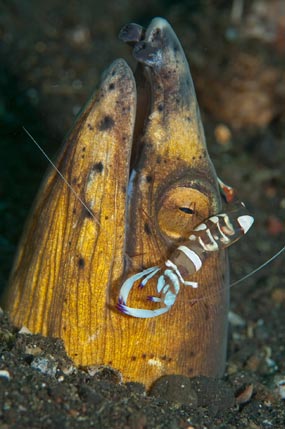 A destra: Simbiosi di pulizia, il gamberetto Periclimenes magnificus sull’anguilla serpente Ophichthus melanochir.