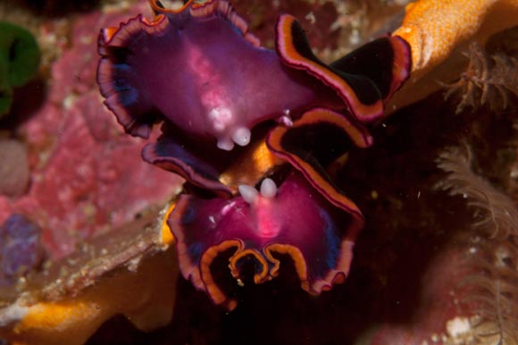 Accoppiamento tra due vermi piatti ermafroditi, Pseudobiceros gloriosus, dotato di due peni acuminati.