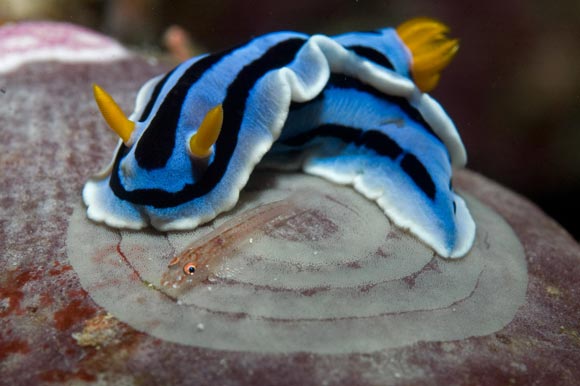 Il nudibranco Chromodoris sp. depone le uova in una spirale schiacciata. Sulle uova il ghiozzo Phyllogobius platycephalops.