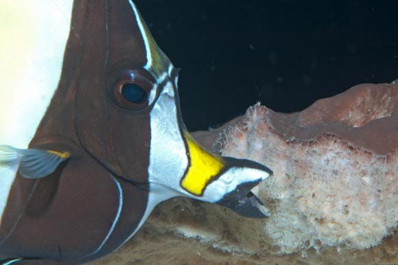 Dettaglio della bocca dell’idolo moresco Zanclus cornutus mentre mangia una spugna.