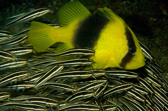 Un banco di pesci gatto Plotosus lineatus in caccia può far fuggire piccoli invertebrati, il pesce sapone Diploprion bifasciatum si accoda per approfittare.