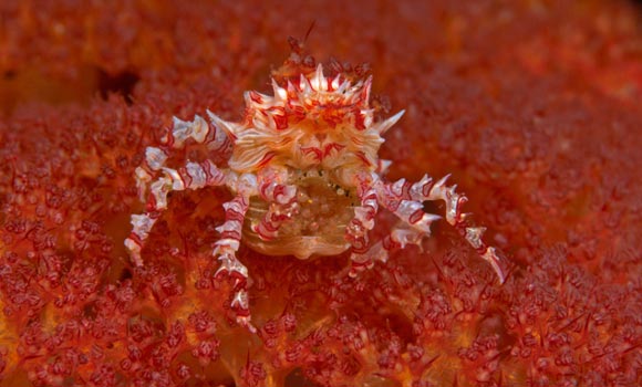 Una femmina del granchio dei coralli molli Hophlophrys oatesii con uova.