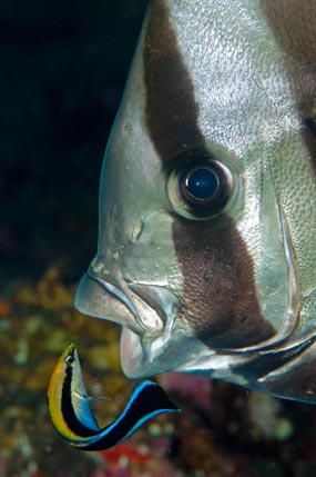A sinistra: Simbiosi di pulizia, il pesce pulitore Labroides dimidiatus si cura dell’igiene orale di Platax pinnatus.