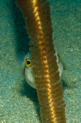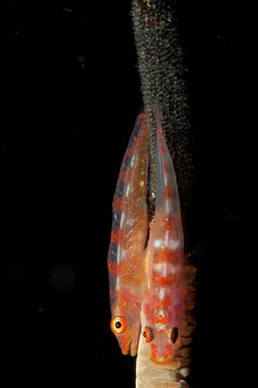 A sinistra: Una coppia di ghiozzi Bryaninops yongei ha deposto le uova su un corallo nero (Cirrhipathes sp.).
