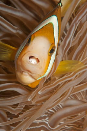 A destra: Amphiprion clarkii apre la bocca e al posto della lingua mostra un isopode cimotoide, un parassita che gli divora la lingua per aderire al pavimento della bocca.