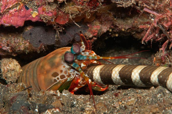 Quando gli animali ci stupiscono: la canocchia Odontactylus scyllarus si sta nutrendo su un serpente di mare (Laticauda colubrina).