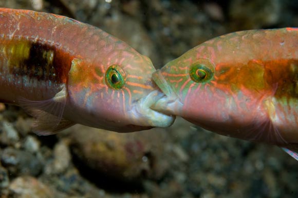 Combattimento tra due maschi del labride Oxycheilinus bimaculatus, che duellano tenendosi per la bocca.