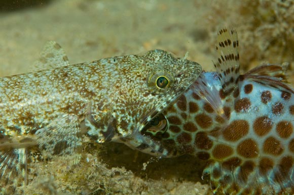 Quando gli animali ci stupiscono: Il pesce lucertola Synodus jaculum ha catturato una cernia, Ephinephelus hexagonatus. Le dimensioni della preda sono eccessive per il predatore, che dovrà lasciarla libera.