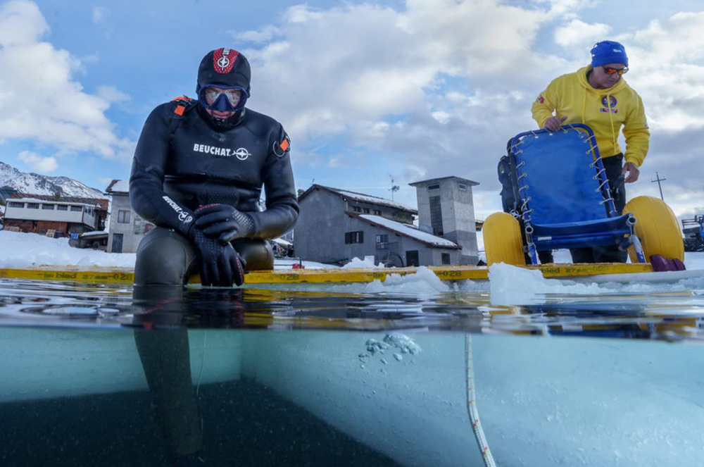 Meno di un minuto per una sfida da brivido sfrecciando nel silenzio fra il foro di partenza a quello d’arrivo, posti appunto a 30 metri di distanza l’uno dall’altro, in un’acqua fredda e con visibilità scarsa, in un lago popolato di pesci e flora, immerso in un panorama di neve e sotto un ghiaccio luminoso ed a più strati.