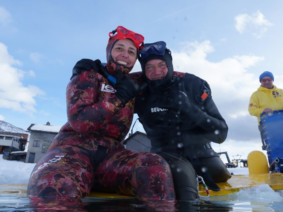 I fotografi subacquei pluripremiati Ilaria Mariagiulia Rizzuto e Pietro Formis hanno supportato e dato assistenza per tutta la parte documentaristica subacquea dell’impresa, rimanendo oltre un’ora sotto la superficie ghiacciata del lago per immortalare i momenti migliori sia durante le prove tecniche che durante il record.