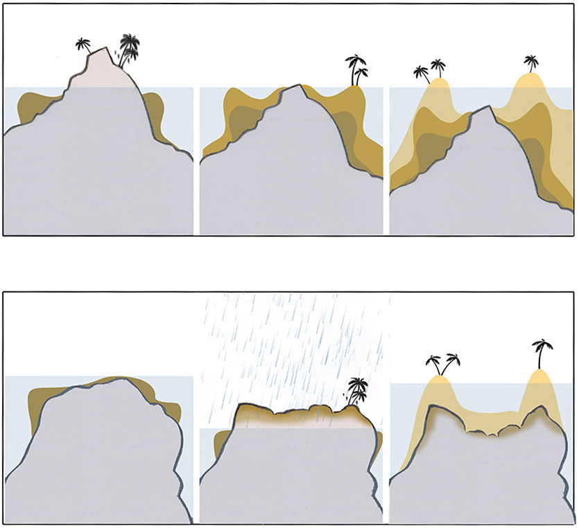 Darwin suppose che l’atollo si formasse sempre attorno a un’isola e diventasse un anello per sprofondamento della crosta terrestre: il reef, accrescendosi verso l’alto, raggiunge la superficie anche quando l’isola è affondata. In realtà la teoria di Darwin è stata dimostrata vera in alcuni casi ma altri meccanismi possono essere chiamati in causa, come l’abbassamento del livello dei mari durante le glaciazioni, che porta una secca coperta di corallo fuori dall’acqua. L’emersione uccide il reef, le piogge (comunque più acide dell’acqua di mare) fanno il resto sciogliendo soprattutto la parte interna della secca (il fenomeno è noto come carsismo). Al successivo innalzamento del livello del mare la secca sarà già predisposta per la crescita di un bell’atollo (a condizione, ovvio, che venga ricolonizzata da madrepore vive).