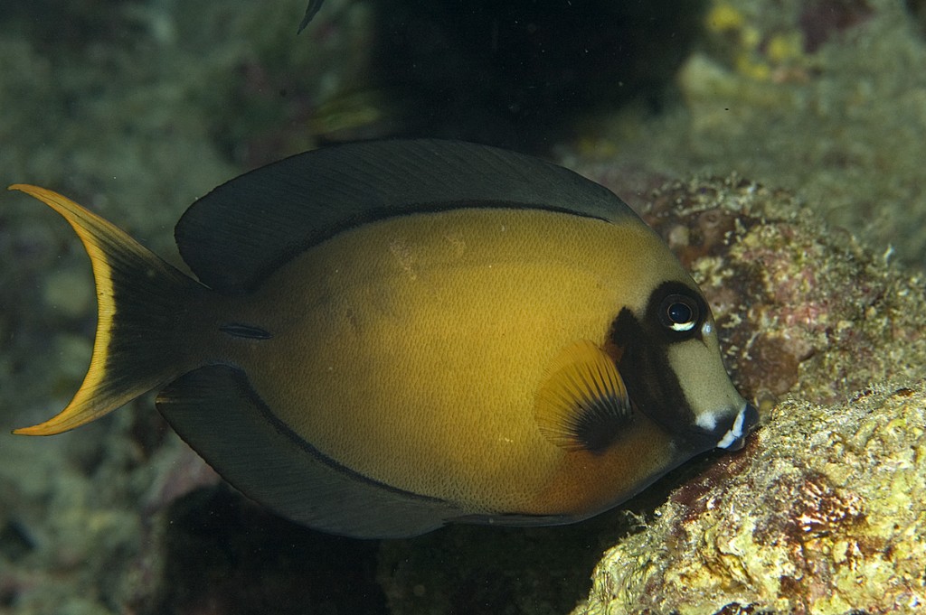 Acanthurus pyroferus, pesce chirurgo del Pacifico, non è appariscente di suo. L’adulto (sopra) ha un colore marrone, con dei chiaroscuri. È buono da mangiare, i grossi adulti son protetti, come tutti i pesci chirurgo, dagli affilatissimi aculei retrattili ai lati del peduncolo caudale. Questi aculei sono presenti anche nelle forme giovanili, ma sono piccoli e probabilmente non così taglienti.