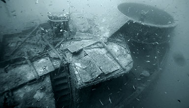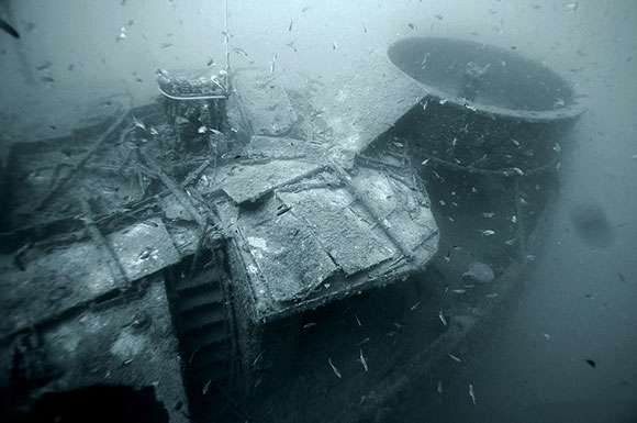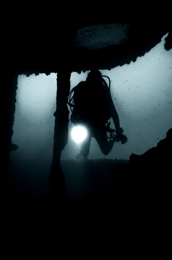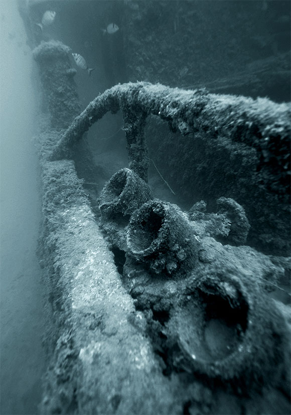 Pinneggiamo lentamente tra le lamiere di un relitto ben conservato e ancora in assetto di navigazione. E’ un rimorchiatore piuttosto piccolo, lungo circa 33 metri per 8 metri di larghezza.