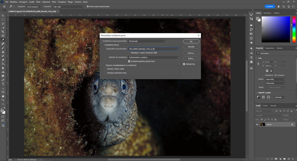 Se ho una fotografia in spazio colore Adobe RGB e voglio capire come apparirà quando la stampo con la mia stampante su carta Canson Baryta, posso seguire questi passaggi: