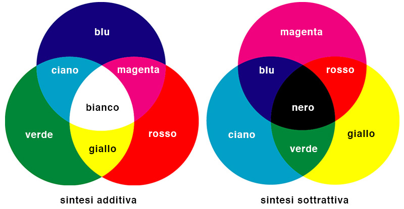 Le stampanti e i sistemi di stampa tipografica, invece, usano un sistema sottrattivo CMYK, basato sui colori Ciano, Magenta, Giallo e Nero, che combinandosi generano il verde, il blu e il rosso.