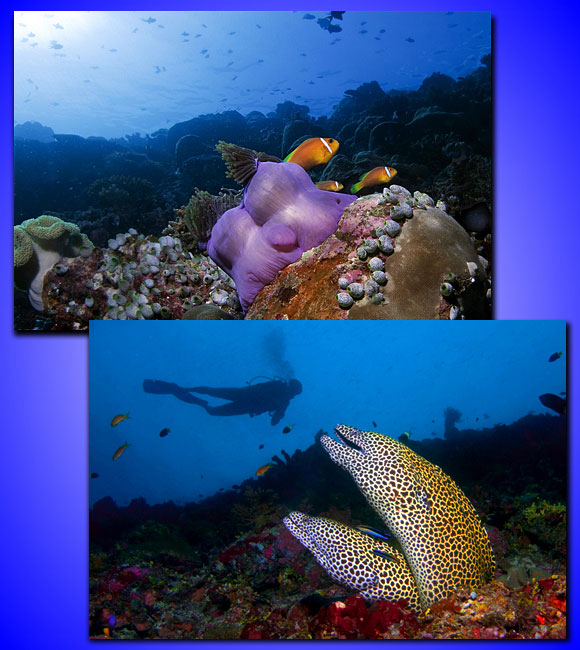 Nella prima foto, preso dalla inquadratura dei pagliaccetti ho trascurato la pinna del sub che mi precedeva, rovinando lo scatto. Nella seconda foto, invece, aver ripreso un sub sullo sfondo è estremamente efficace soprattutto quando si ha la necessità di enfatizzare le dimensioni dell’animale.