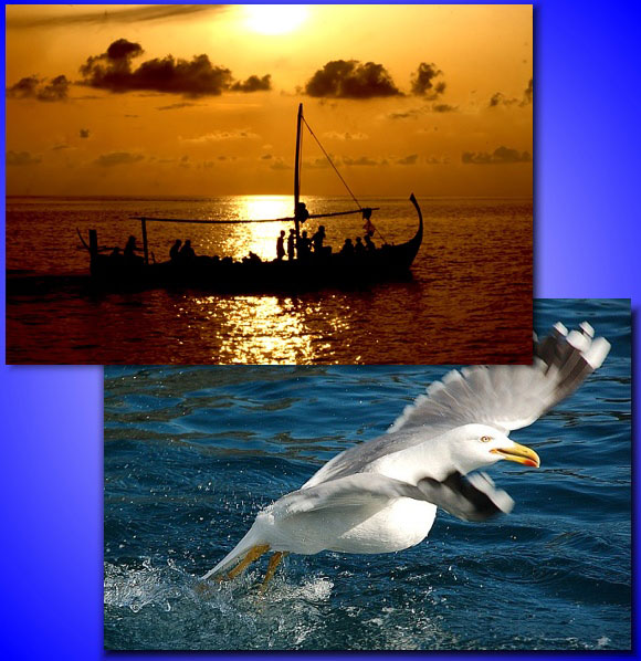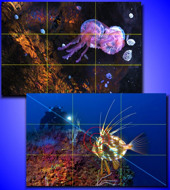 La regola dei terzi: nella prima immagine il soggetto principale è posizionato nell’intersezione delle linee delimitanti i terzi in alto a destra. Nella seconda, immagine più complessa, il culmine dell’attenzione cade nella intersezione in alto a sinistra ed il pesce è al centro dell’immagine lungo la diagonale costituita da esso stesso ed il soggetto in secondo piano.