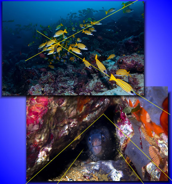Un altro criterio compositivo efficace consiste nel cercare di far ricadere il centro di attenzione al vertice di angoli. L’occhio sarà così portato a raggiungere il soggetto all’apice di un triangolo oppure verso il punto di fuga di una prospettiva (cioè il punto dove apparentemente convergono le linee parallele verso l’orizzonte). Oppure, semplicemente, analogamente alle diagonali, l’intersecarsi di linee dona dinamicità all’immagine. Ora, è chiaro che i pesci e le formazioni rocciose ben si guardano dal soddisfare queste nostre esigenze, starà a noi scoprirle al momento dello scatto e, ancora di più quando saremo all’asciutto, davanti al nostro computer.
