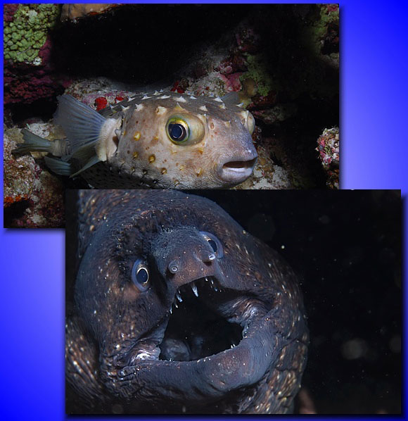 Il pesce istrice ha la messa a fuoco sull’occhio più prossimo a noi e questa allegra murena ha gli occhi entrambi a fuoco, inoltre è inquadrata al terzo sinistro e leggermente inclinata per conferire dinamicità al ritratto.