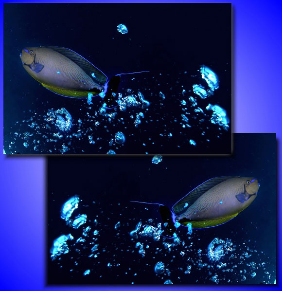 La chiave di lettura di queste due immagini può essere differente modificando il posizionamento delle due componenti: le bolle ed il pesce, quest’ultimo può sembrare che stia “arrivando” o “andando” a seconda di come sia impostata la riflessione.