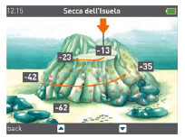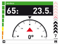 Anche la classica modalità Extend va ben oltre la tradizionale visualizzazione delle informazioni. Il display è suddiviso in due parti: a sinistra ci sono i dati digitali (profondità, tempo zero, ecc.), mentre a destra sono visualizzate immediatamente tutte le pause necessarie (deep stop, pause di decompressione, pause di sicurezza) con durata e profondità. Queste due finestre sono separate da una colonna d’acqua (scala delle profondità), in cui il sub può momentaneamente sostare. Un altro modo per visualizzare i vari scenari dell’immersione senza alcuna possibilità d’equivoco. Sta a voi scegliere la modalità che preferite utilizzare per le vostre immersioni! La modalità si può cambiare in qualsiasi momento, oppure, in caso di bisogno, si può passare alla bussola digitale. La bussola, che naturalmente è visualizzata a colori e non ammette compromessi, garantisce una navigazione subacquea straordinariamente semplice. I dati importanti dell’immersione restano sempre visibili. Ma la bussola non è la sola a indicare dove si sta andando. Per l’orientamento è possibile richiamare anche le mappe subacquee: un’altra novità assoluta nei computer per immersioni! Il computer è in grado di memorizzare immagini e foto e, di conseguenza, anche le mappe digitali dei siti d’immersione più noti.