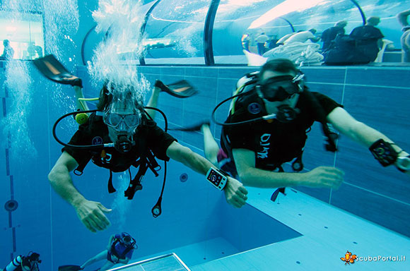 Con l’occasione anche noi abbiamo avuto la possibilità di provarne uno e di portarlo sul fondo della piscina Y-40 per giocarci un po’. Su e giù tra mille bolle ci siamo subito abituati ad averlo al polso, bello, come quei ‘giocattoli’ mix di tecnologia e design che ci piacciono tanto anche fuori dall’acqua.