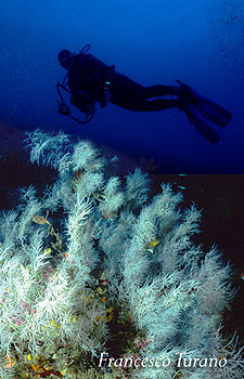 Nulla si è fatto per far conoscere e conservare la foresta di gorgonie mediterranee probabilmente più bella del mondo, nulla si è fatto per tutelare un ambiente incredibilmente ricco e vitale. Ma trovandomi a parlare di corallo nero e poiché sicuramente il lato positivo della faccenda è che in un modo o nell’altro viene alla luce una questione importante, ovvero la segnalazione delle meraviglie viventi nel mare dello Stretto di Messina, mi tuffo nell’argomento spiegando in poche parole di che animale stiamo parlando. Il nome comune del corallo nero è Antipatario del Mediterraneo mentre il nome scientifico, lo abbiamo già visto, è Antipathes subpinnata. Appartiene all’ordine degli Antipatari e i suoi polipi, cioè le unità viventi che formano poi nell’insieme una colonia, hanno 6 tentacoli corti, non pinnati, il che classifica questo celenterato come esacorallo. Sott’acqua, nel suo ambiente, si presenta con rami simili a folti ciuffi bianchi, con sfumature ceneree, fortemente ramificati. Si trova sempre sotto i 50/60 metri di profondità e l’incontro per il subacqueo è difficile e occasionale. Oggi la specie è considerata protetta, in funzione della sua delicatezza e della sua sensibilità ai mutamenti ambientali.