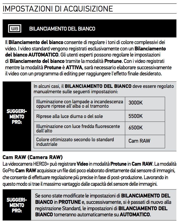 Insieme al PROTUNE possiamo decidere di registrare in CAMERA RAW, le immagini vengono catturate direttamente dal sensore alla massima risoluzione ottenendo dei file poco elaborati, lo possiamo paragonare alla differenza che c’è tra fare foto in RAW o JPG, questa impostazione però richiede un po’ di pratica, direi per ora di lasciarla da parte.