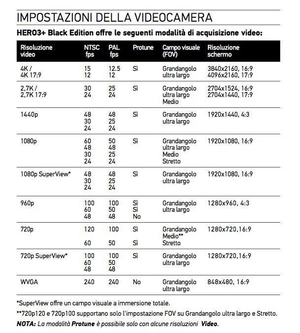 La tabella qui sopra vi spiega la differenza tra i vari formati, sott’acqua direi che la cosa migliore sia riprendere in Full HD 1080p, in base al tipo di campo visuale (FOV) che volete utilizzare potete scegliere tra i 60, 50, 48, 30, 25, 24 fps.