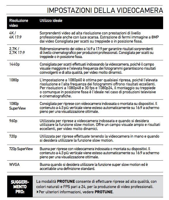 Esiste poi un’altra impostazione di cui dobbiamo tenere conto per la risoluzione video, si tratta del PROTUNE, questa modalità video offre un’elevata velocità dati che consente di acquisire immagini con minor compressione, questo ci permetterà di ottenere dei colori più naturali e di poterli migliorare in fase di post produzione con la correzione colore.