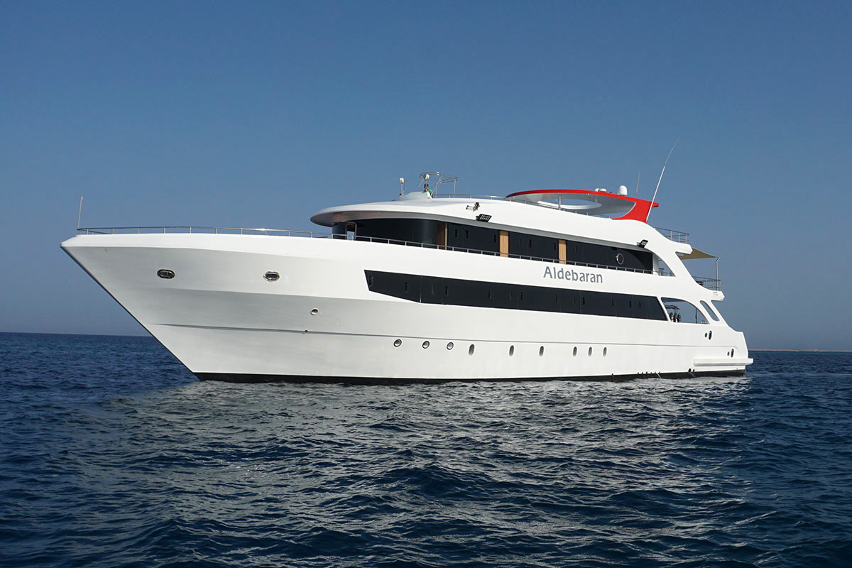 La crociera si svolge a bordo del M/Y Aldebaran, un yacht impiegato regolarmente per crociere subacquee nel Mar Rosso. L’imbarcazione è lunga circa 39 metri e naviga attorno ai 12 nodi, con una capacità massima di circa 26 ospiti distribuiti in cabine con servizi privati su main deck e upper deck.