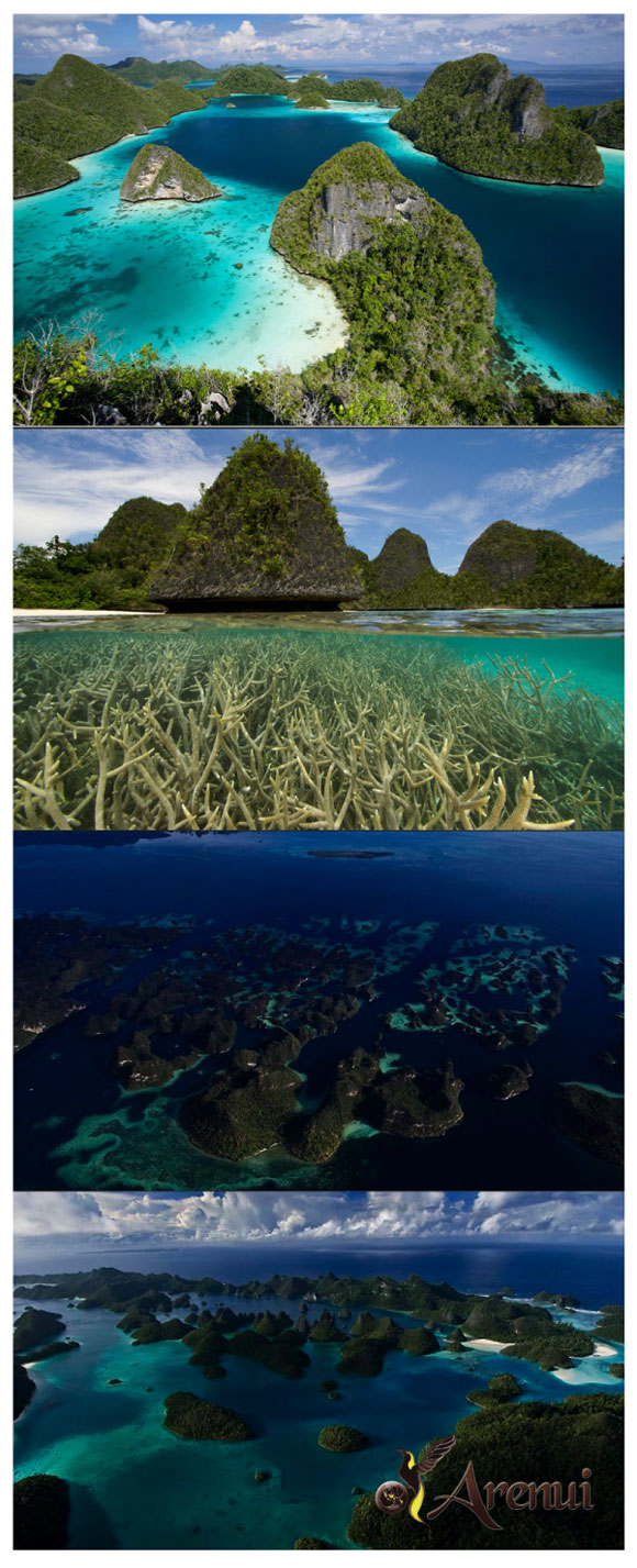 La sua varietà paesaggistica è talmente eterogenea da rendere possibile la convivenza di una quantità impressionante di specie differenti in un’area relativamente ridotta: pareti vulcaniche battute dalle onde, acque blu e profonde che si insinuano tra le mangrovie fino a quelle rese meno cristalline dal plancton e Krill che fluttuano attorno all’isola di Misool.