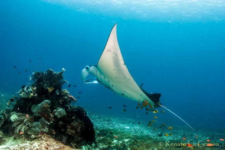 Le immersioni si svolgono tra pinnacoli, pareti e reef esposti alla corrente, con grandi banchi di pesce tropicale e presenza frequente di mante, squali di barriera e tartarughe marine.