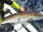 Essendo a poche pinnate di distanza, ho visto ogni particolare e decido di fare altrettanto. Appena ne passa uno vicino lo prendo per la coda e per la pinna dorsale piegandola ma basta un’esitazione, un movimento sbagliato ed uno squalo di queste dimensioni 2 m di ca. 100 kg potrebbe staccarti un braccio o una gamba in un colpo solo é un fascio di muscoli guizzanti, ma riesco a trattenerlo. In effetti ci vuole molta forza.