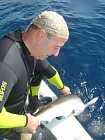 Appena giunto sulla barca tolgo la bombola e mi metto sulla pedana di poppa ad aspettare che gli squali silk, passino vicino pronto ad afferrarne uno e ci riesco anche questa volta, dando la possibilità a Carlo e ad Ivo di fare le foto di rito e di toccare la loro pelle, seta per un verso, carta vetrata nell’altro.