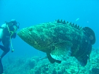 Lo tengo solo un minuto, per la foto di rito, ma devo stare attento, quando lo lascio andare, che non abbia il muso rivolto verso di me, per evitare un pericoloso “frontale”. Dopo 20 min. d’immersione a 40m, si risale sempre scortati dagli squali, ma stavolta ce anche una grossa cernia.