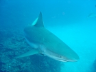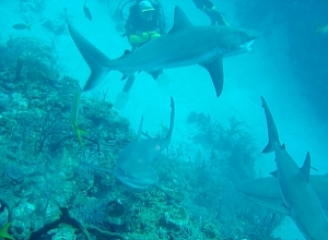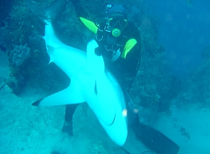 La nostra guida ci propone una seconda immersione al medesimo posto. Portando sempre con se un bel po’ di pesce, questa volta gli squali sono già lì ad aspettarci, sono tanti e vanno da 1,5 a 3 m. all’apertura del sacco gli squali si scatenano, i più lesti si mangiano i barracuda con un boccone, gli altri ci passano vicino ma rimangono “a bocca asciutta”. La curiosità di questi squali è infinita, puntano dritti su di noi e all’ultimo momento ci evitano. La giuda Juada Alberto afferra uno squalo per la coda piegandola così facendo lo squalo resta come paralizzato e si lascia addirittura inarcare volgendo le pinne verso l’alto (ma non è un gatto!!!) resta in questa posizione per circa un minuto poi Juada Alberto lo lascia andare.
