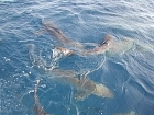 La loro danza dura circa 10 minuti il tempo di finire il cibo, poi i più grossi si allontanano e restano solo i più piccoli…..si fa per dire, che ci accompagnano fino in superficie. Non so descrivere l’emozione in poche righe ma vi garantisco che è veramente forte. Sulla barca il tema della discussione e un solo….gli squali.