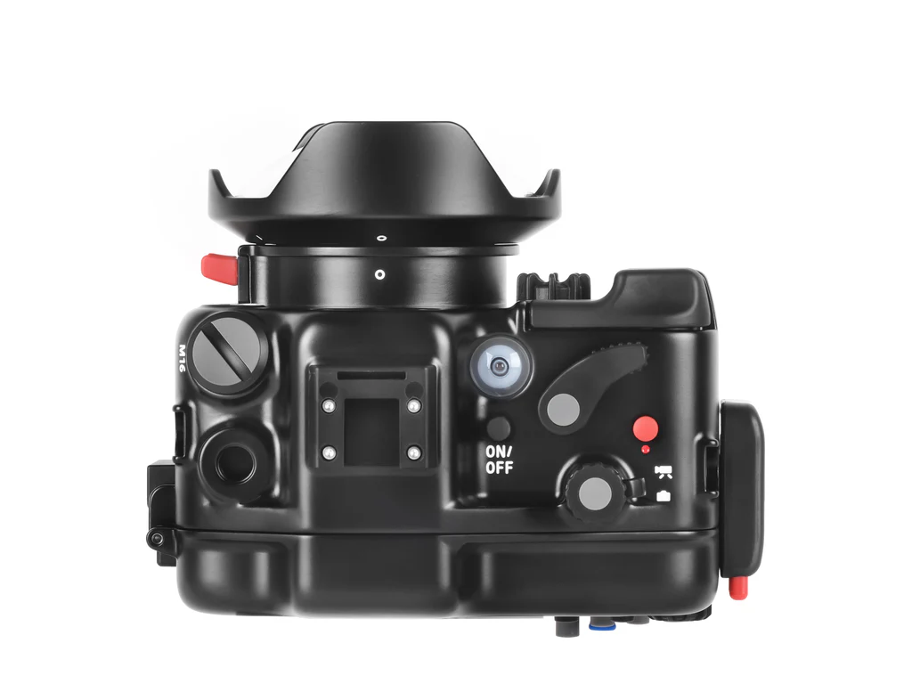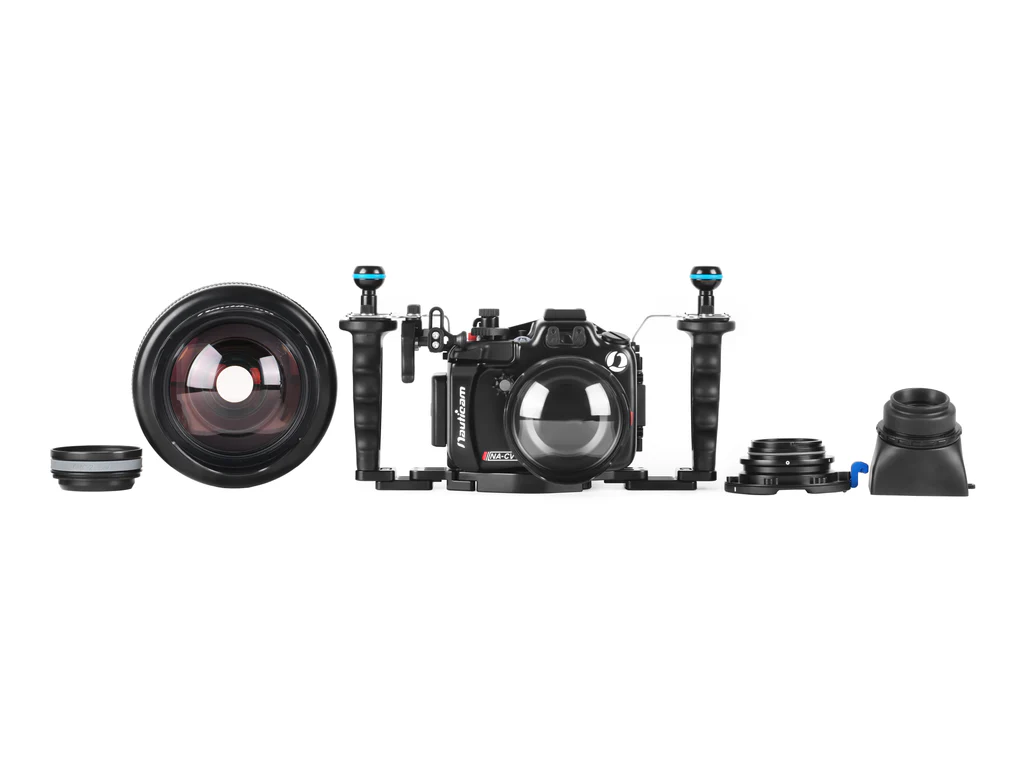 La custodia è compatibile con il collaudato sistema di porte N50. Nella dotazione standard è inclusa una porta cupola acrilica da 3,5″, che consente l’intera escursione dello zoom 16–50 mm. Per esigenze specifiche, sono disponibili porte alternative per grandangolo e macro: