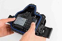 Facile alloggiamento della fotocamera E’ sufficiente fissare l’apposita slitta alla fotocamera per inserirla ed estrarla dalla custodia con estrema semplicità. Non sono necessarie complicate posizioni, tutti i comandi della custodia si allineeranno perfettamente in corrispondenza di quelli della fotocamera. |
