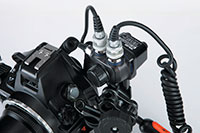 Alloggio per due cavi a fibra ottica Innestando semplicemente i cavi a fibra ottica negli appositi alloggi, la luce del flash incorporato alla fotocamera è indirizzata al flash esterno. Con questo sistema è possibile operare in modo TTL con i nuovi flash YS-D1, YS-110α e YS-01. |