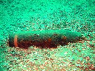 Briefing e….. si parte…profondità per incontrare le bombette -45 / -50m, prese le coordinate OK, OK, OK, si inizia la discesa…. prima di partire Luca mi dice:”scendiamo adagio perché faccio fatica con le orecchie” (le usa di solito per martellare) poi in un attimo siamo a -50m….alla faccia dell’adagio mi dico….. Nella discesa A -40 si intravedono alcune munizioni da mortaio sparse un po’ ovunque, a -45 ne appare un gruppo compatto per arrivare poi a -50 con altre sparse un po’ ovunque. Il tempo e il sedimento stanno ormai ricoprendo e distruggendo tutto, la visibilità non é eccezionale, tra i 5 e gli 8 metri, ma per me uomo abituato alle “oscure” acque luganesi (o luganeghe) è giorno pieno. L’immersione si sviluppa tra i -40 e -50 mt mentre la permanenza sul fondo di 12 min.