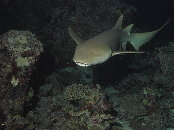 Le luci dei compagni rischiarano il fondo di sabbia bianca, le torce accese illuminano tutte le direzioni, l’atmosfera è così suggestiva da sembrare un film di fantascienza. Alberto ci fa segno di seguirlo, il computer segna 5 metri, la corrente si fa più intensa e ci lasciamo trasportare senza sforzo. Procediamo attraverso un canale che sembra una strada sterrata tra tanti blocchi di corallo, quando dal nulla spunta una squadriglia di carangidi (caranx caranx), sono enormi e così vicini che ci sfiorano, sono attratti dalla luce che sfruttano per cacciare i pesci più piccoli. Scatto velocemente una foto ed il flash fa risplendere decine di fianchi argentati che con un guizzo spariscono inghiottiti dal buio. Torna la calma, cerchiamo di contrastare la corrente aggrappati al corallo morto, attendiamo pochi secondi e poi ripartiamo. La corrente è tale che non riusciamo a fermarci, improvvisamente mi trovo davanti due esemplari di squalo nutrice, saranno lunghi almeno un metro e mezzo, questione di secondi e quasi entriamo in collisione. Pur essendo noto come uno squalo inoffensivo per il subacqueo, il nutrice se infastidito o spaventato può diventare pericoloso e sferrare dei morsi agli ingenui malcapitati. Tradito dall’emozione e spinto dalla corrente non faccio in tempo a spostarmi e una pinna caudale mi colpisce sul volto, la maschera si allaga e sono costretto a mollare tutto per avere le mani libere, per fortuna macchina fotografica e torcia sono assicurate agli spallacci del gav con moschettoni d’acciaio! Mentre svuoto la maschera penso all’occasione mancata di scattare un bel primo piano al nutrice, spero d’incontrarli di nuovo, e questa volta di essere pronto allo scatto.