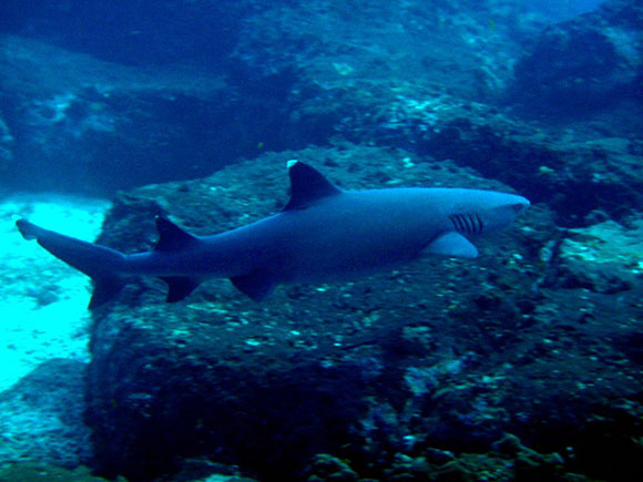 media. Nella scarsa lattiginosa visibilità dovuta alla sospensione, squali pinna